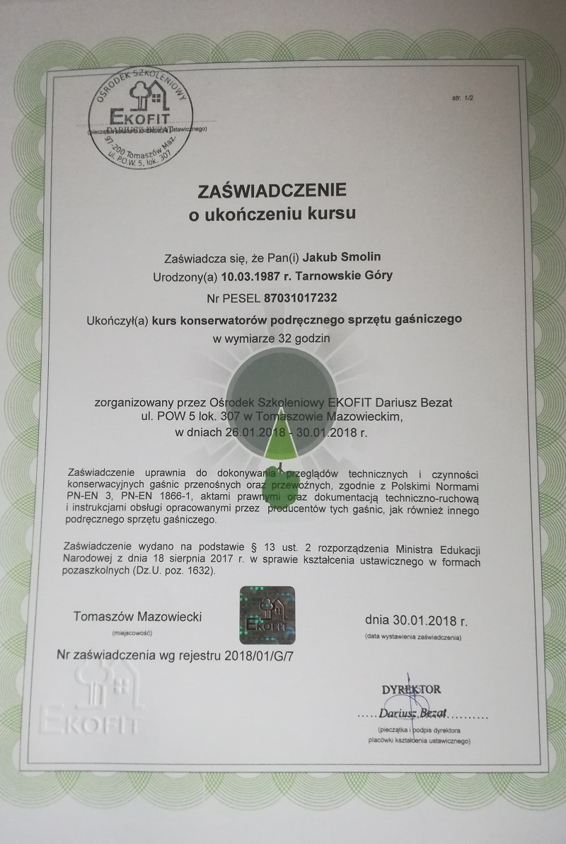 - przeglądów, konserwacji i naprawy sprzętu gaśniczego